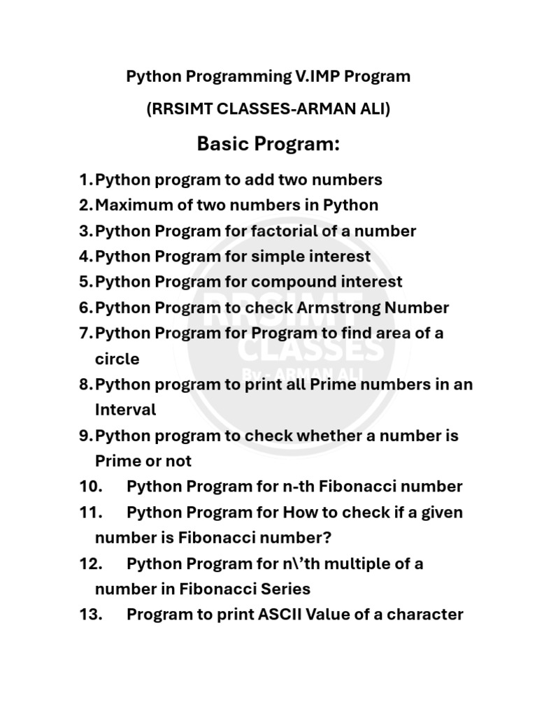 Python Programming 100+program (RRSIMT CLASSES | PDF