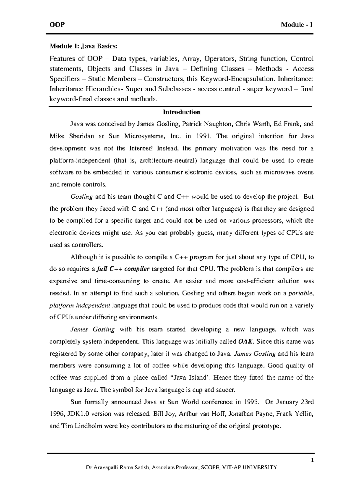 Module 1 Notes - JAVA BASICS - 1 Module I: Java Basics: Features of OOP ...