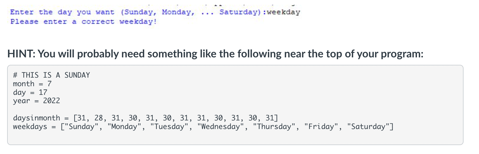 Solved Prompt the user for a day of the week (e.g., Sunday, | Chegg.com