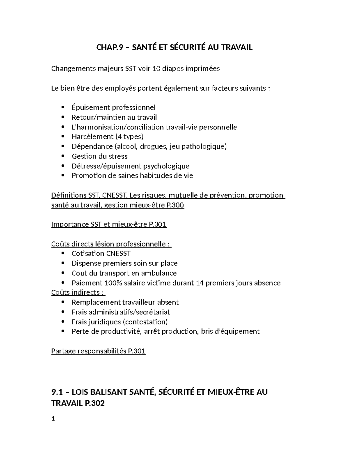 Chap.9 révision livre exam final - CHAP – SANTÉ ET SÉCURITÉ AU TRAVAIL ...