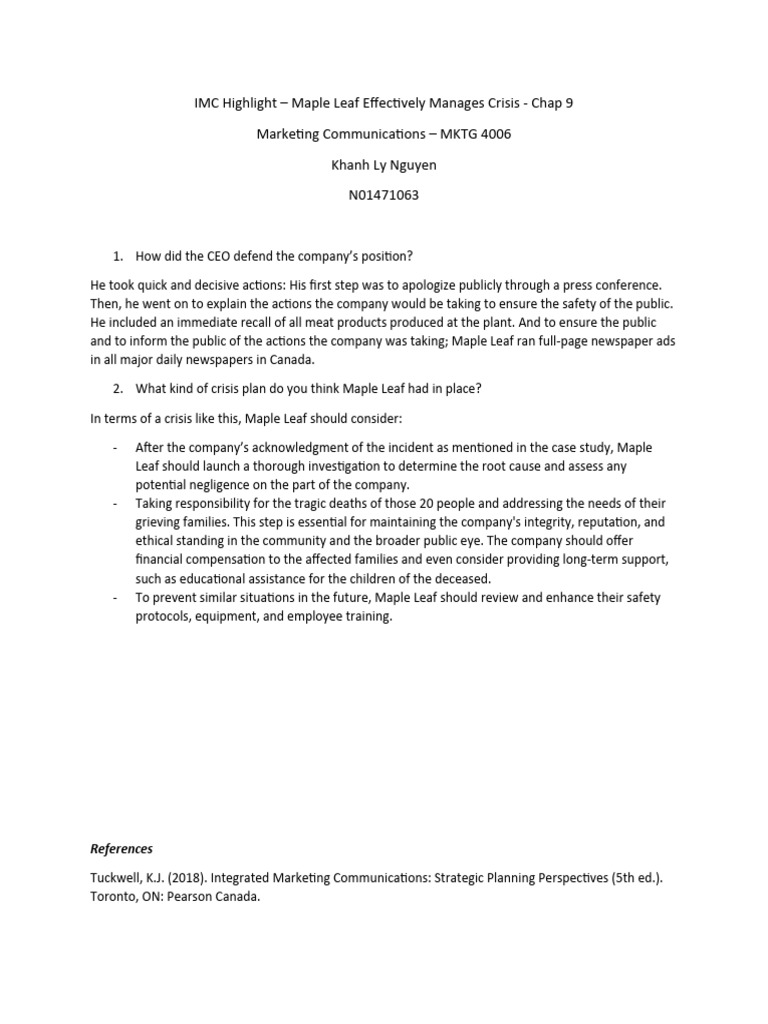 MKTG 4006 - IMC Highlight - Chap 9 - Maple Leaf Effectively Manages ...