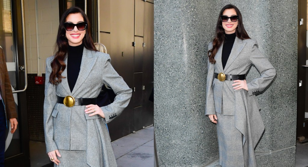 Anne Hathaway gives checked tailoring an asymmetric twist in New York