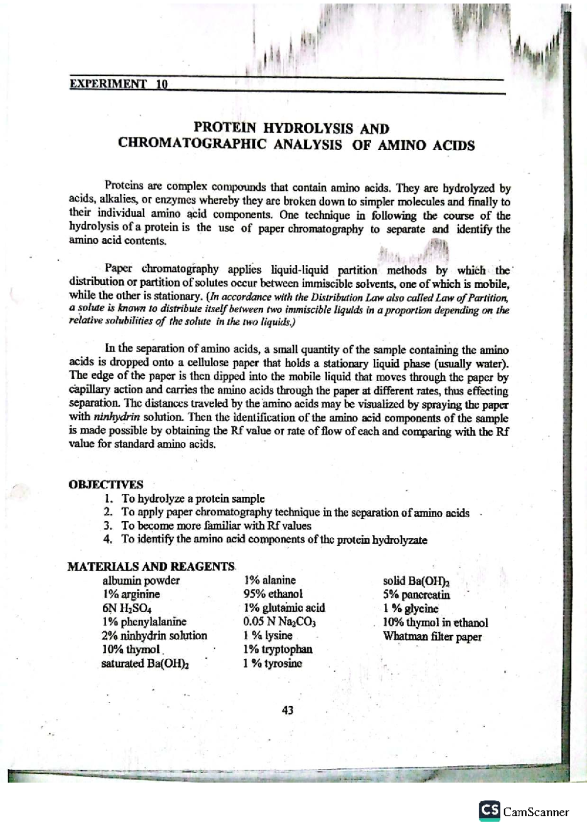 Experiment 10: Protein Hydrolysis & Chromatographic Analysis of Amino ...