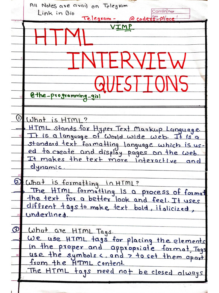 HTML Interview Questions - Part 1 Handwritten Notes | PDF