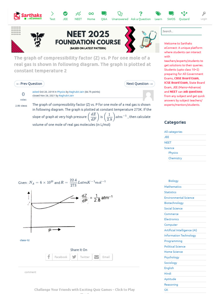 The graph of compressibility factor (Z) vs. P for one mole of a real ...
