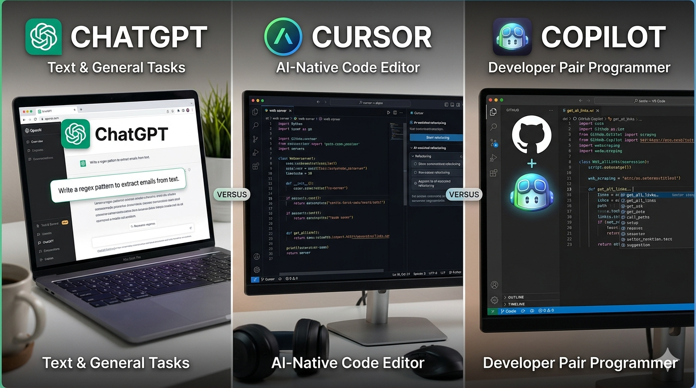 Based on this image's title: “ChatGPT vs Cursor vs GitHub Copilot | Which AI Coding Tool Is Best for ...”