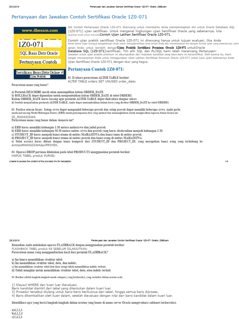 Contoh Soal Dan Jawaban Sertifikasi Oracle 1Z0-071 Gratis - DBExam | PDF