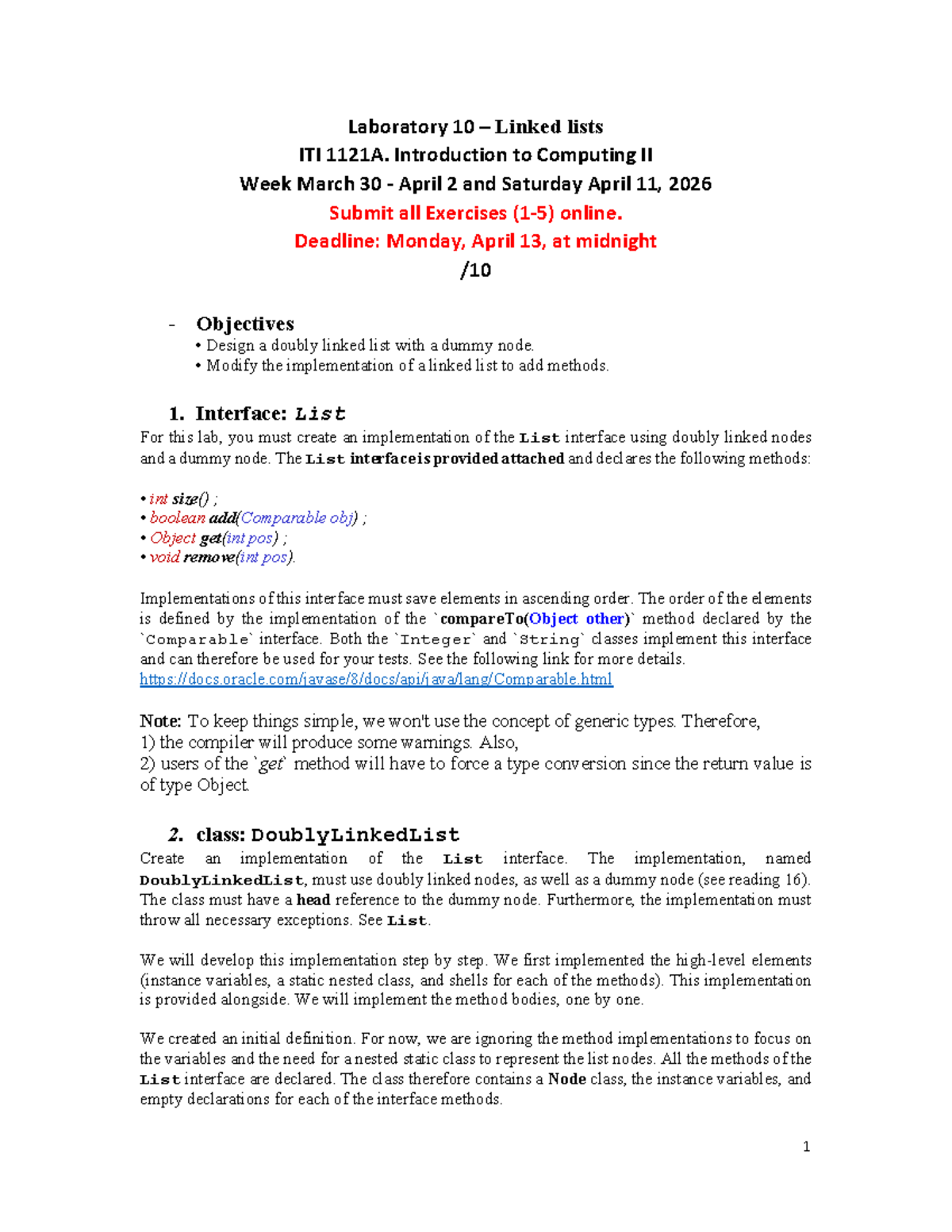 LAB114 - Lab 11: Iterators and Linked Lists in ITI 1121A - Studocu