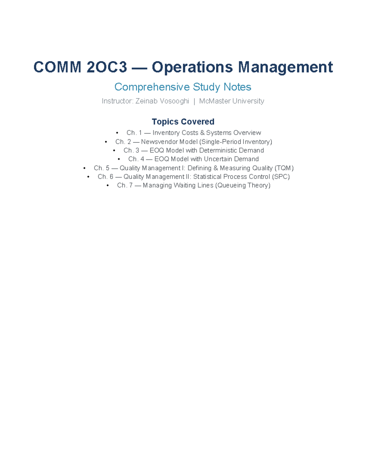 COMM 2OC3 Operations Management Comprehensive Study Notes - Studocu