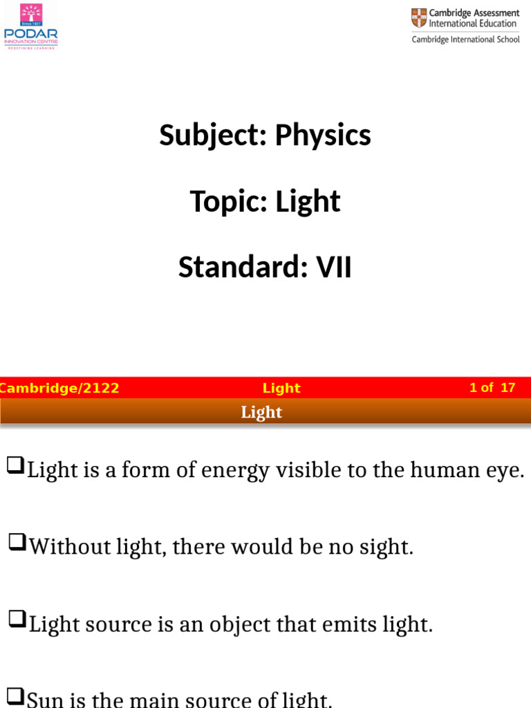 PPT1 - Cambridge - VII - Phy - Unit 12 - Light | PDF | Light | Shadow