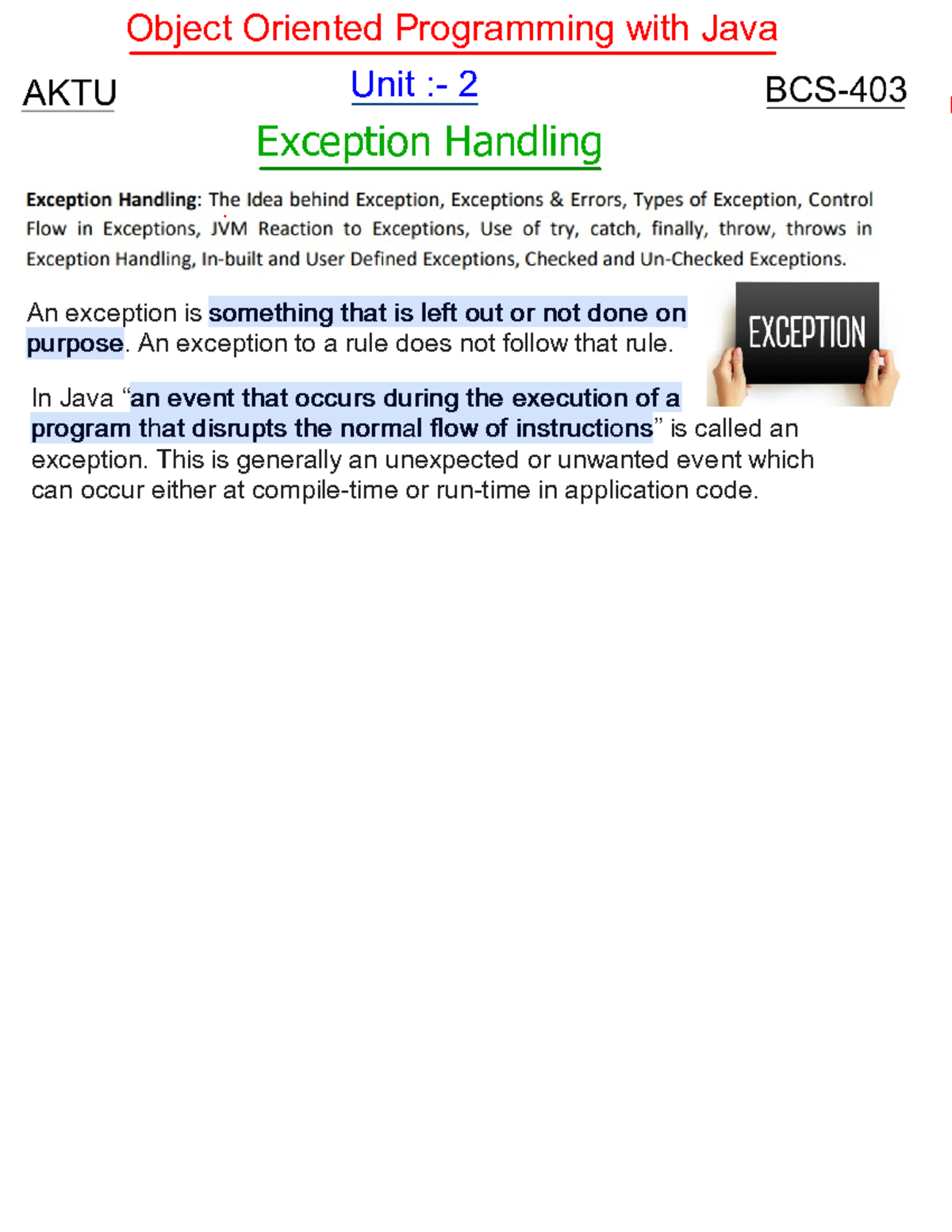 Java OOPS Exception Handling Overview | BCS 403 | Aktu 4th Sem - Studocu