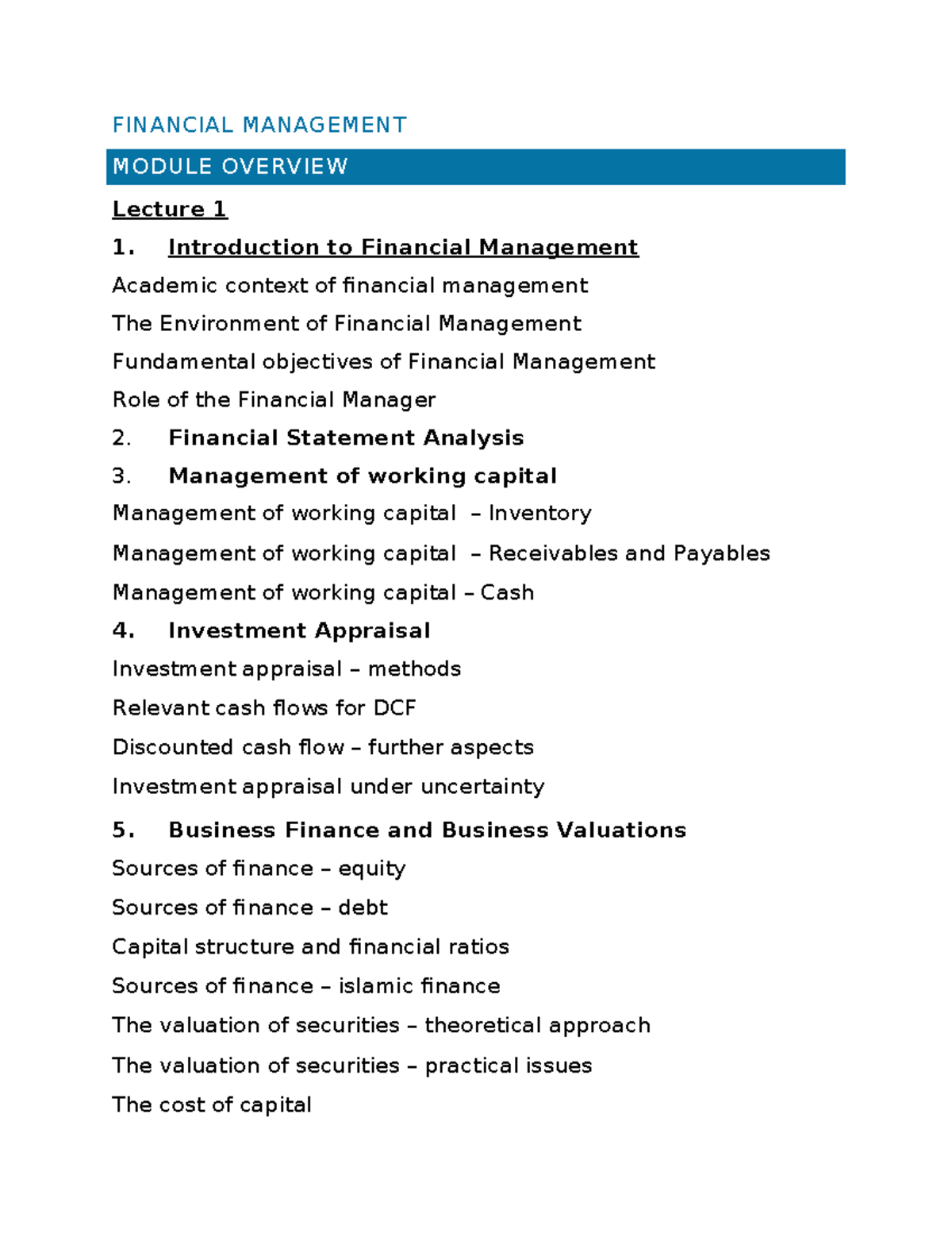 Course Summary Financial Management - Lecture 1: Introduction to ...
