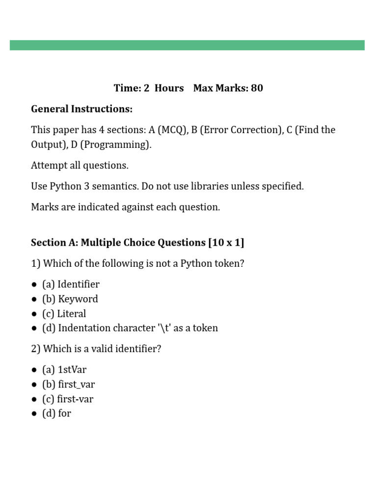 Python I Year I Sem Model Exam Question Set (100 Marks) - Studocu