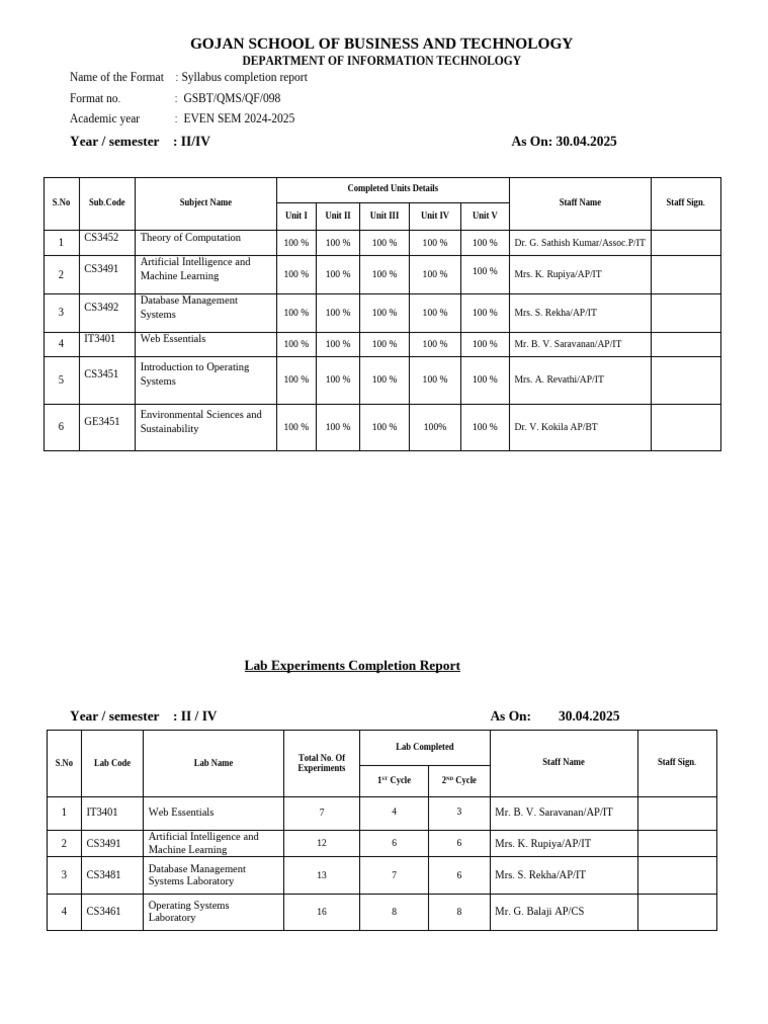 It - II Year - Syllabus Completion 2024-2025 | PDF