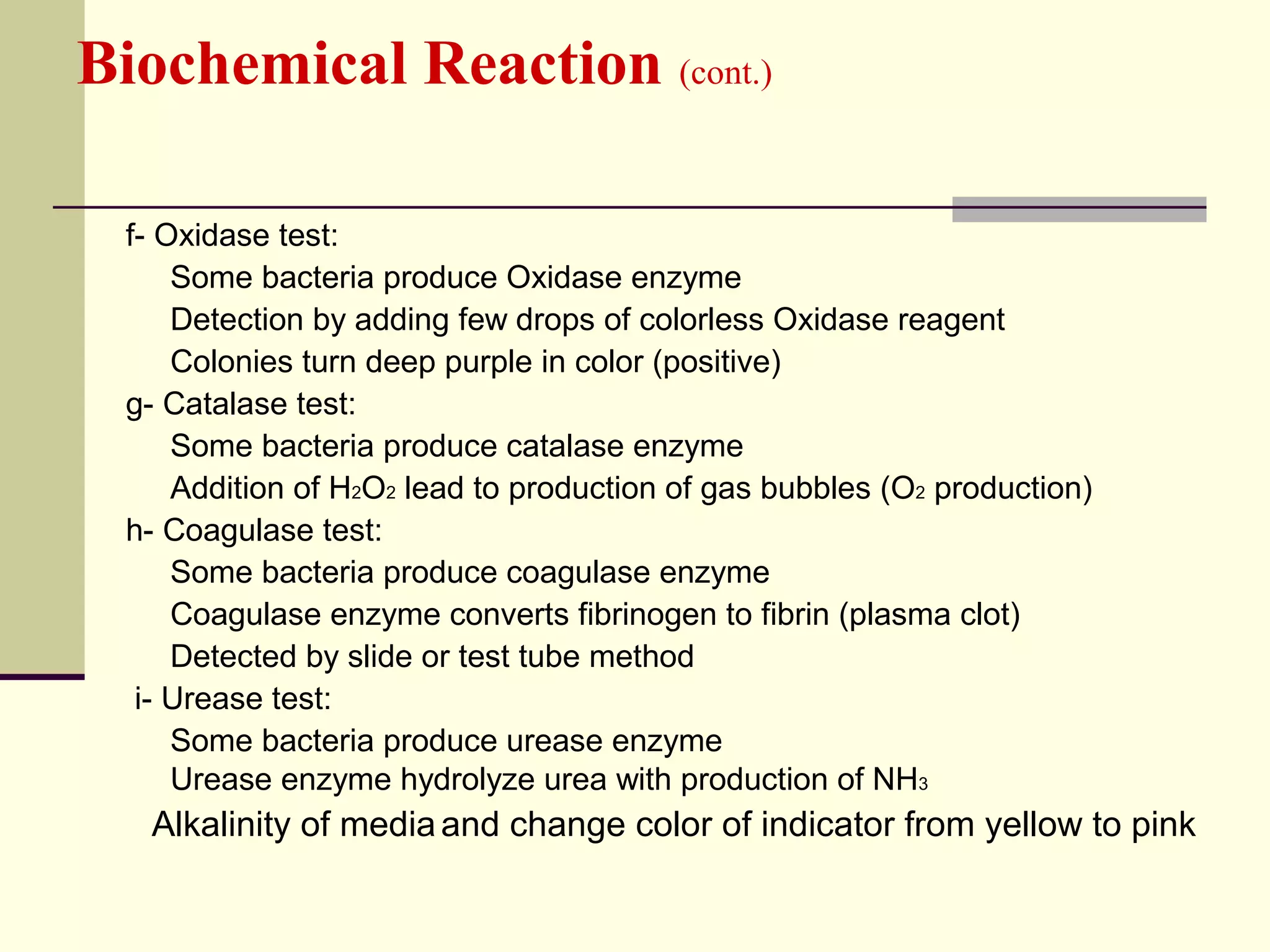 Tests for enzymes 1 Catalase test 2 Oxidase