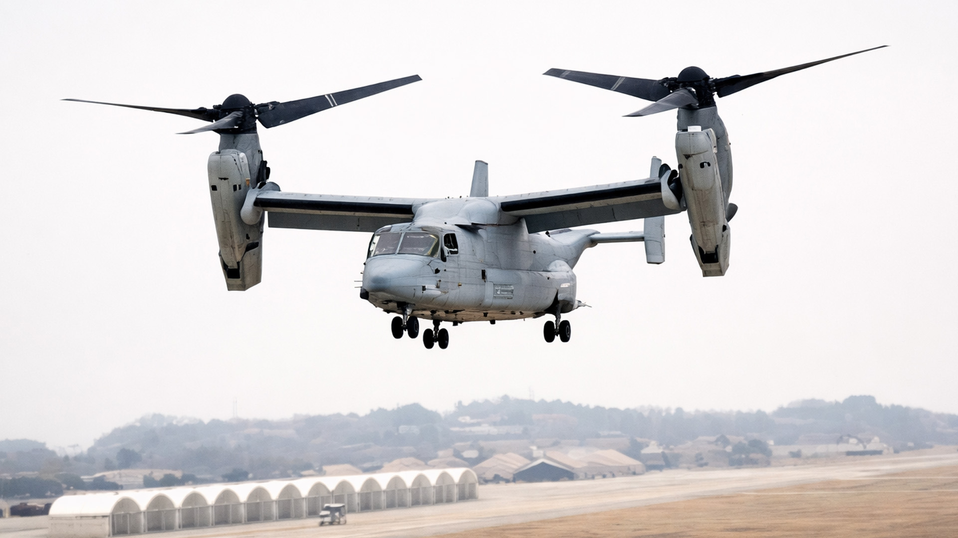 Amerikaanse mariniers vliegen met Osprey-vliegtuig boven militaire basis