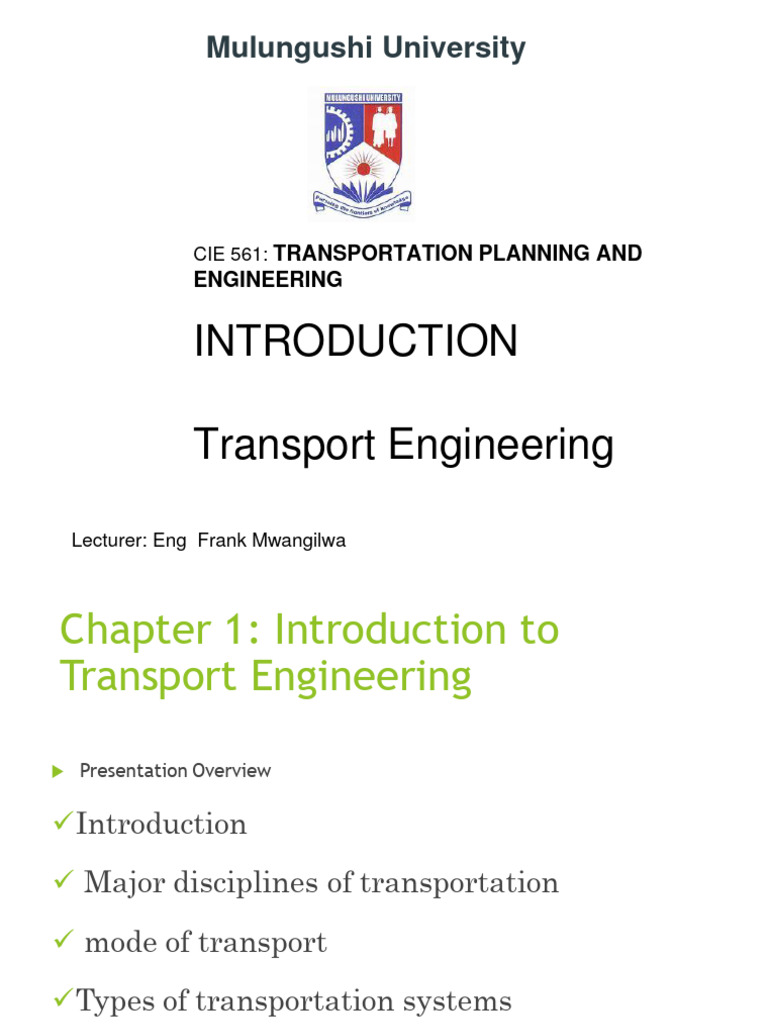 Transport Engineering Intoduction.pdf - Mulungushi University CIE 561 ...