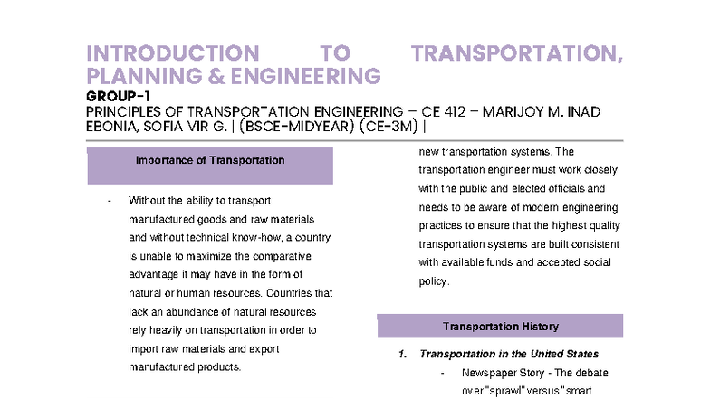 Introduction to Transportation Planning & Engineering CE 412 - Studocu