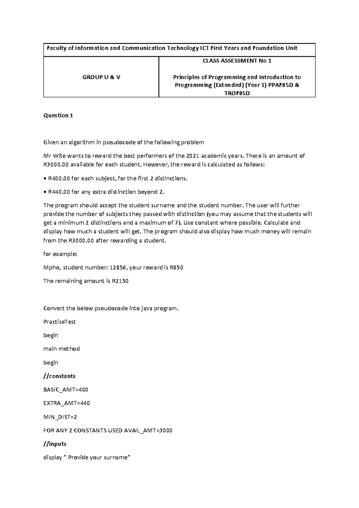 CLASS TEST 2B PPAF05D/TROF05D MAY 2024: Principles of Programming - Studocu