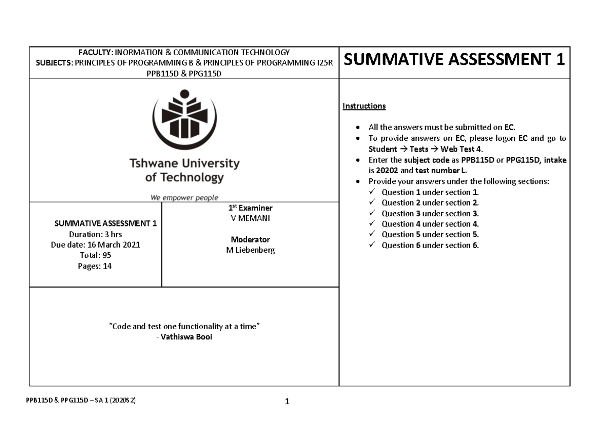 PPA115D Formative Assessment 1: Programming Principles Guide 2025 - Studocu