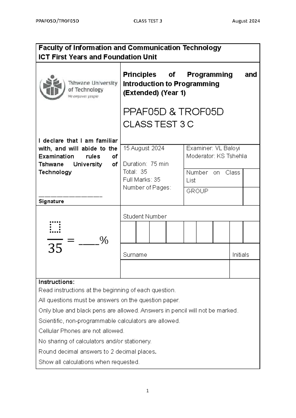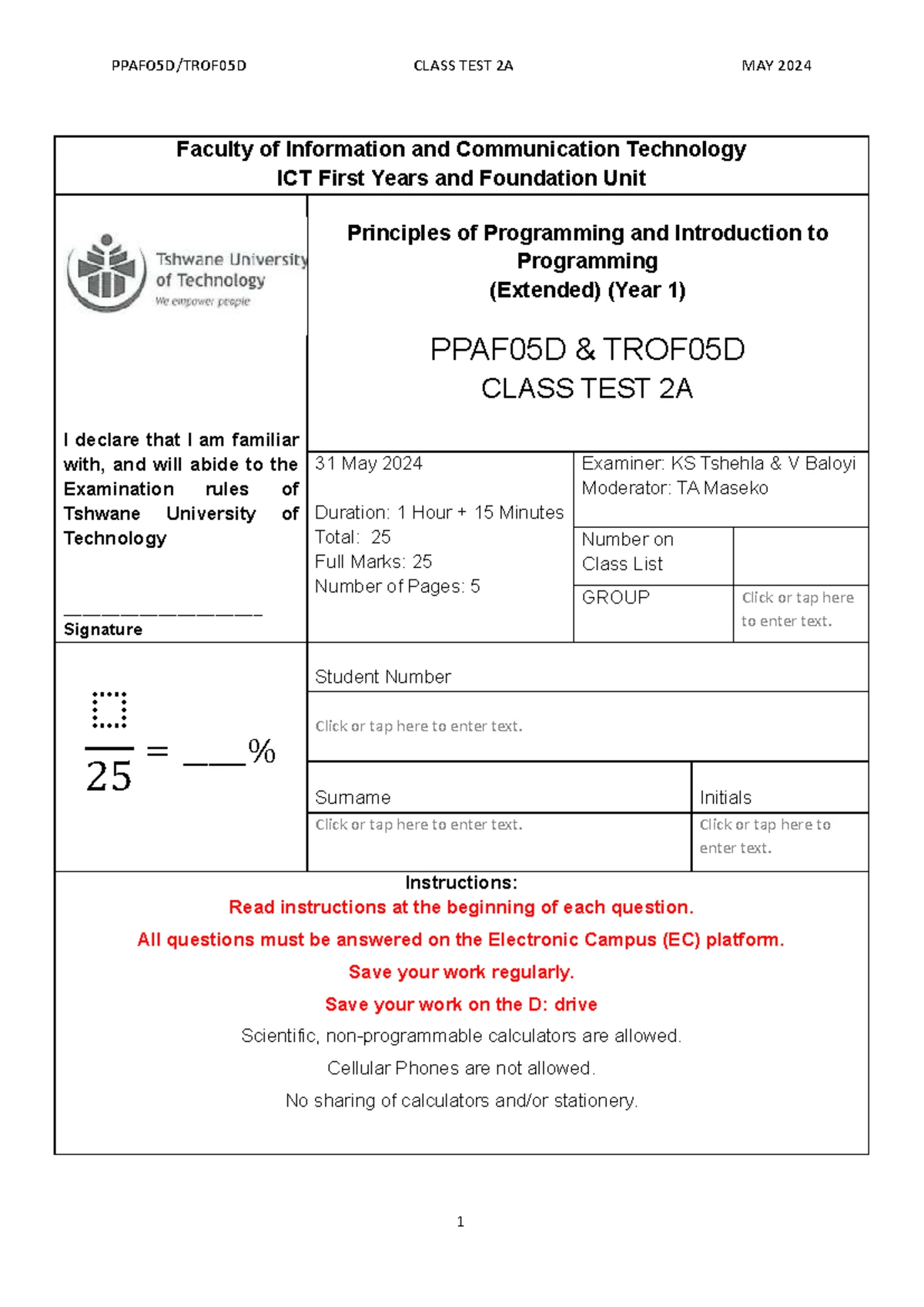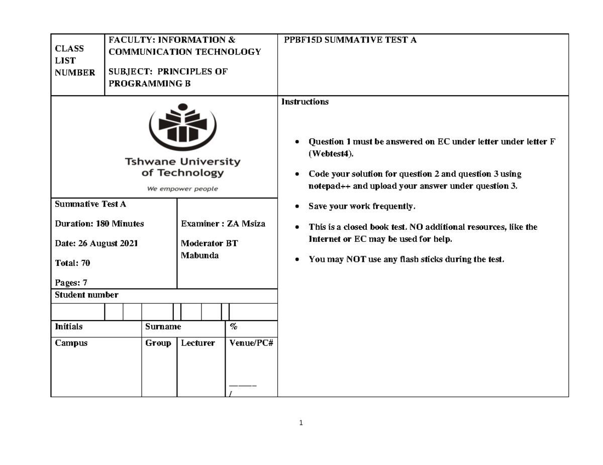 PPAF05D Friday Class Test - Faculty of Information and Communication ...