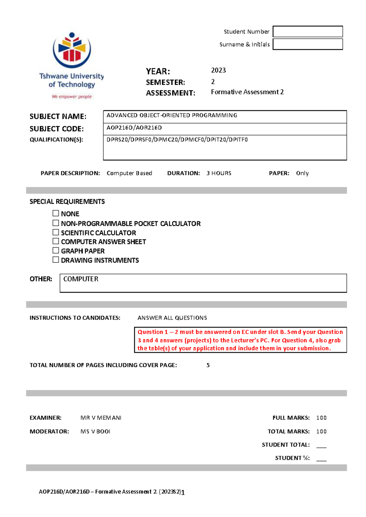 AOP216D AOR216D 2023S2 ST2 - YEAR: Student Number Surname & Initials ...