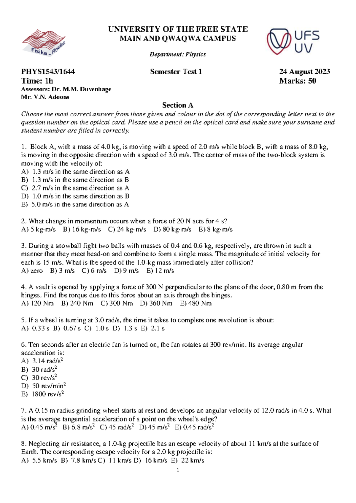 PHYS1543/1644 Semester Test 1 - 24 Aug 2023 Insights & Answers - Studocu