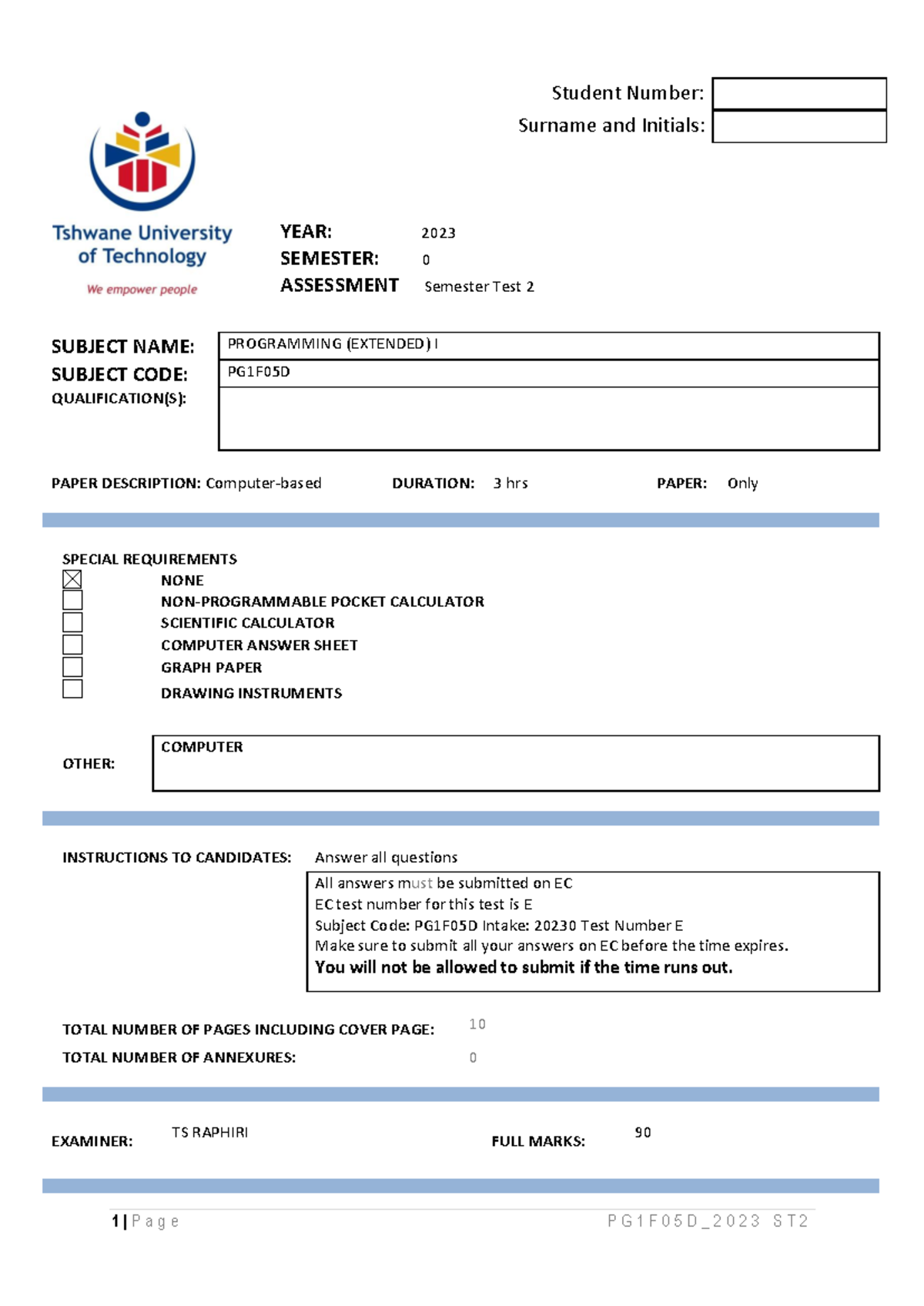 CFA115D Semester Test 2 Question Paper 2023S1 - Computing Fundamentals ...