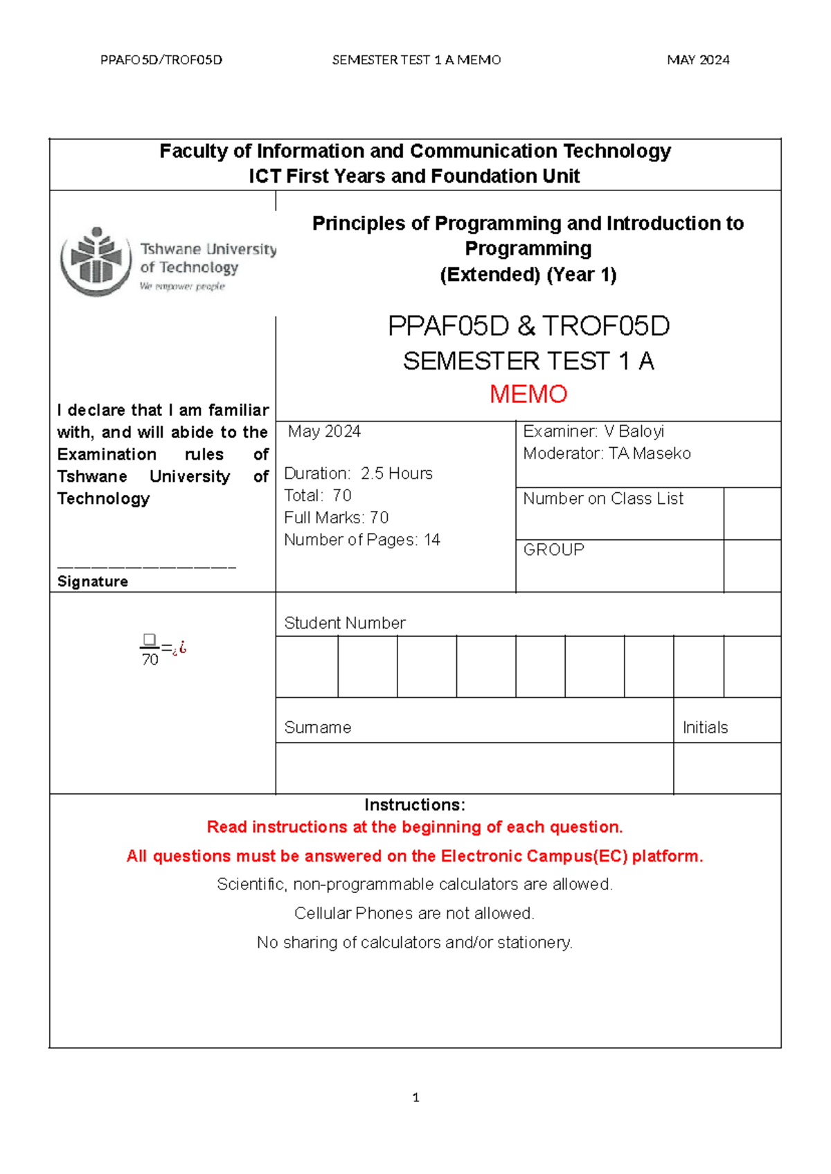 Semester Test 1 Memo May 2024 - PPAF05D & TROF05D Programming ...