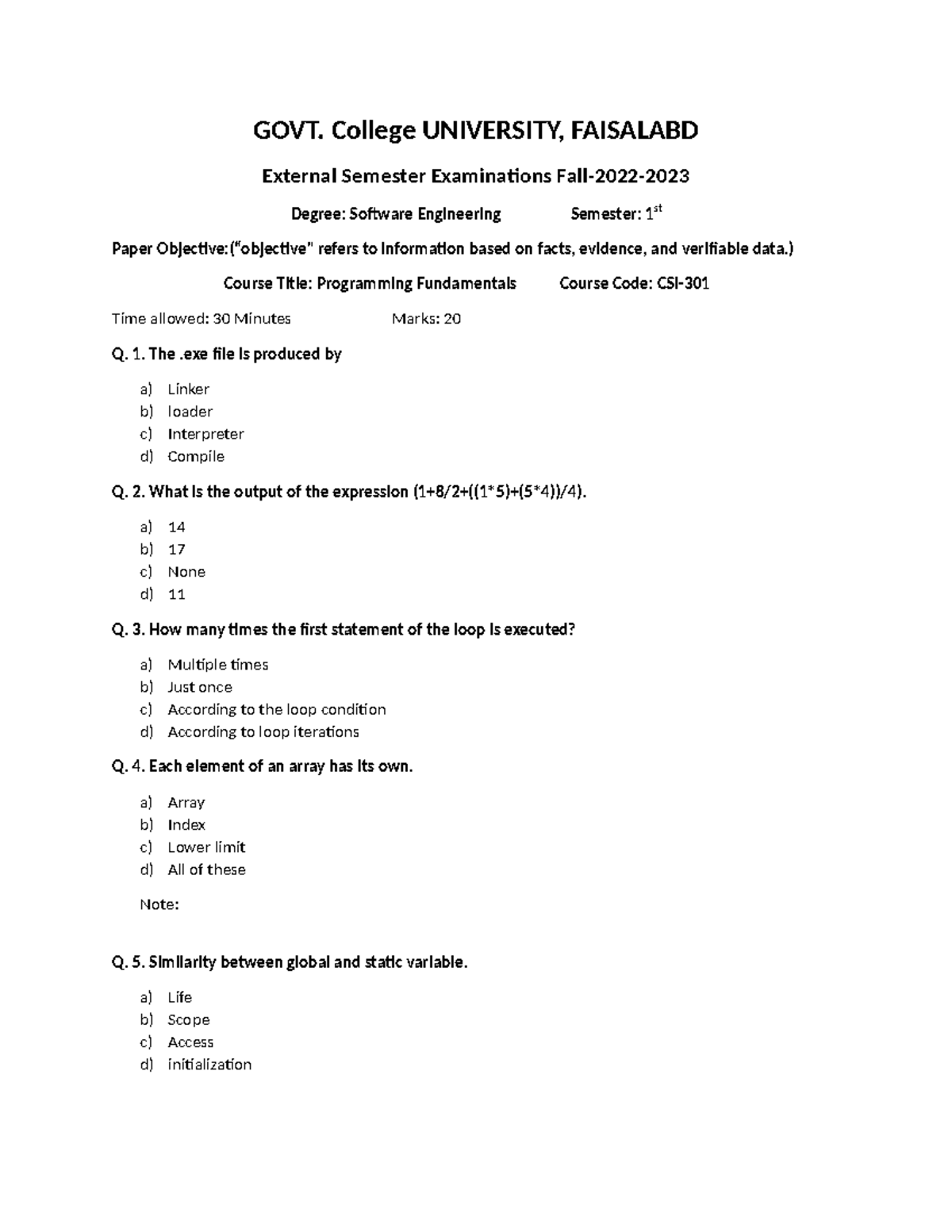 Past Paper: Programming Fundamentals (Course Code: SE101) - Semester 1 ...