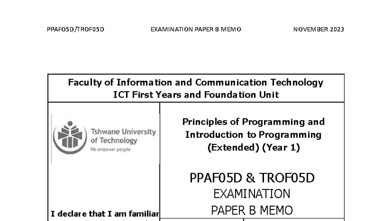 EXAMINATION PAPER B MEMO PPAF05D TROF05D NOVEMBER 2023 - Studocu