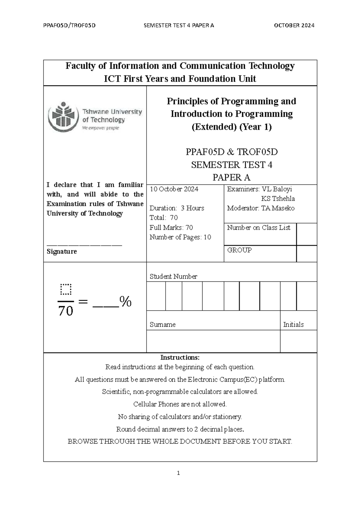 Semester Test 4 Paper A - Principles of Programming (PPAF05D, TROF05D ...