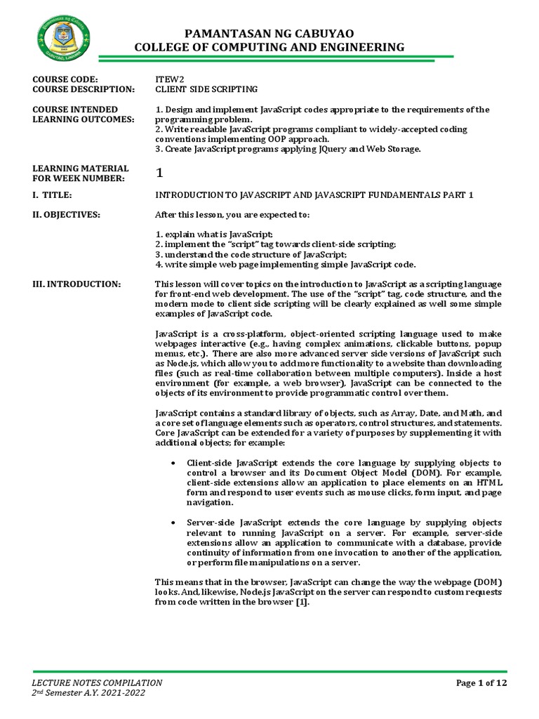 ITEW2 WEEK 1 Introduction To JavaScript and JavaScript Fundamentals ...