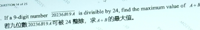 Solved: If a 9 -digit number overline 20236B19A is divisible by 24 ...