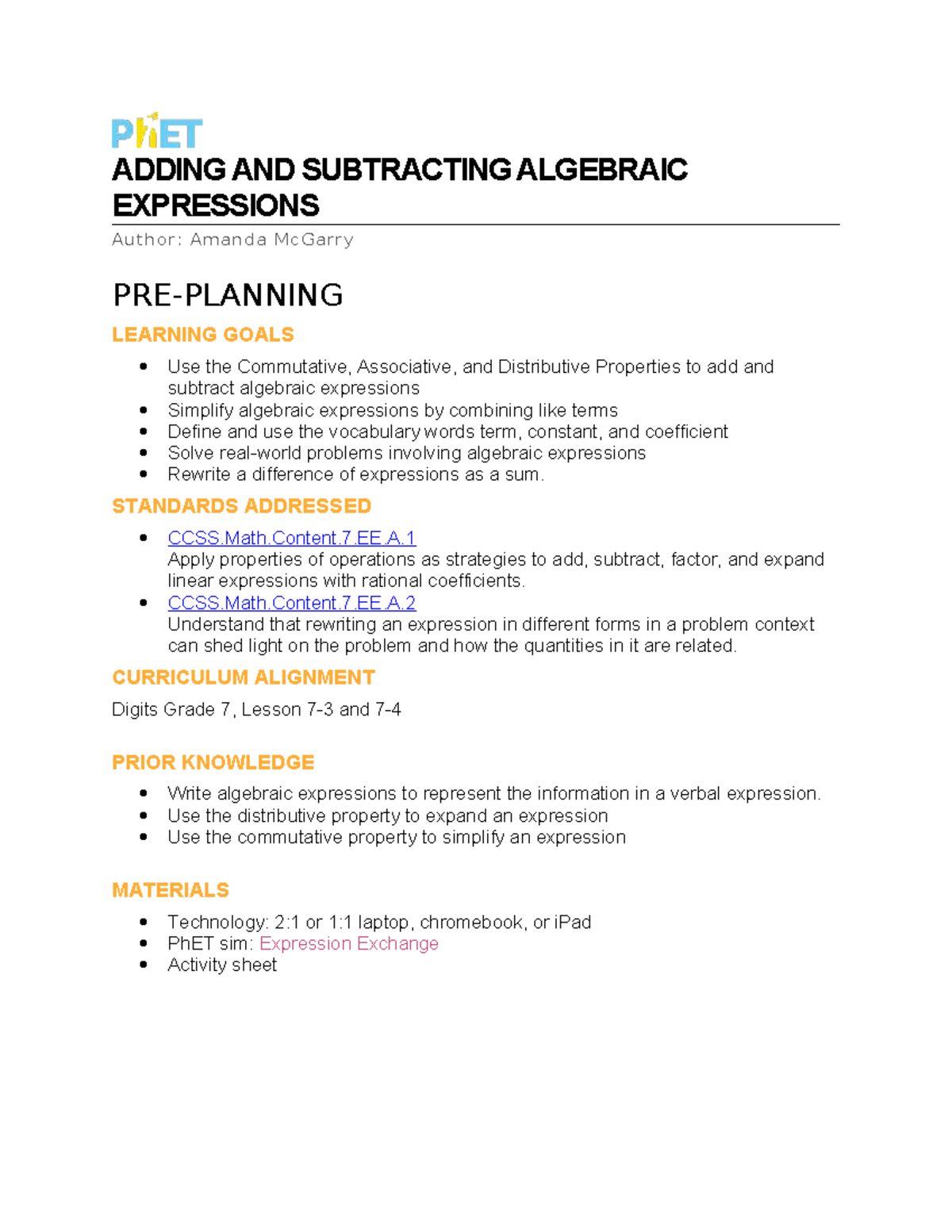 Grade 7 Digits Lesson: Adding & Subtracting Algebraic Expressions - Studocu