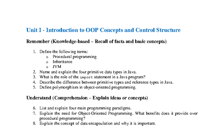 Java OOP - Unit 1 Question Bank (R23 Academic Year 2024-2025) - Studocu