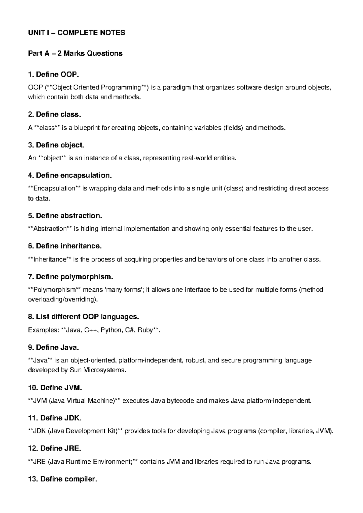 OOP Concepts & Definitions - Unit I Complete Notes - Studocu