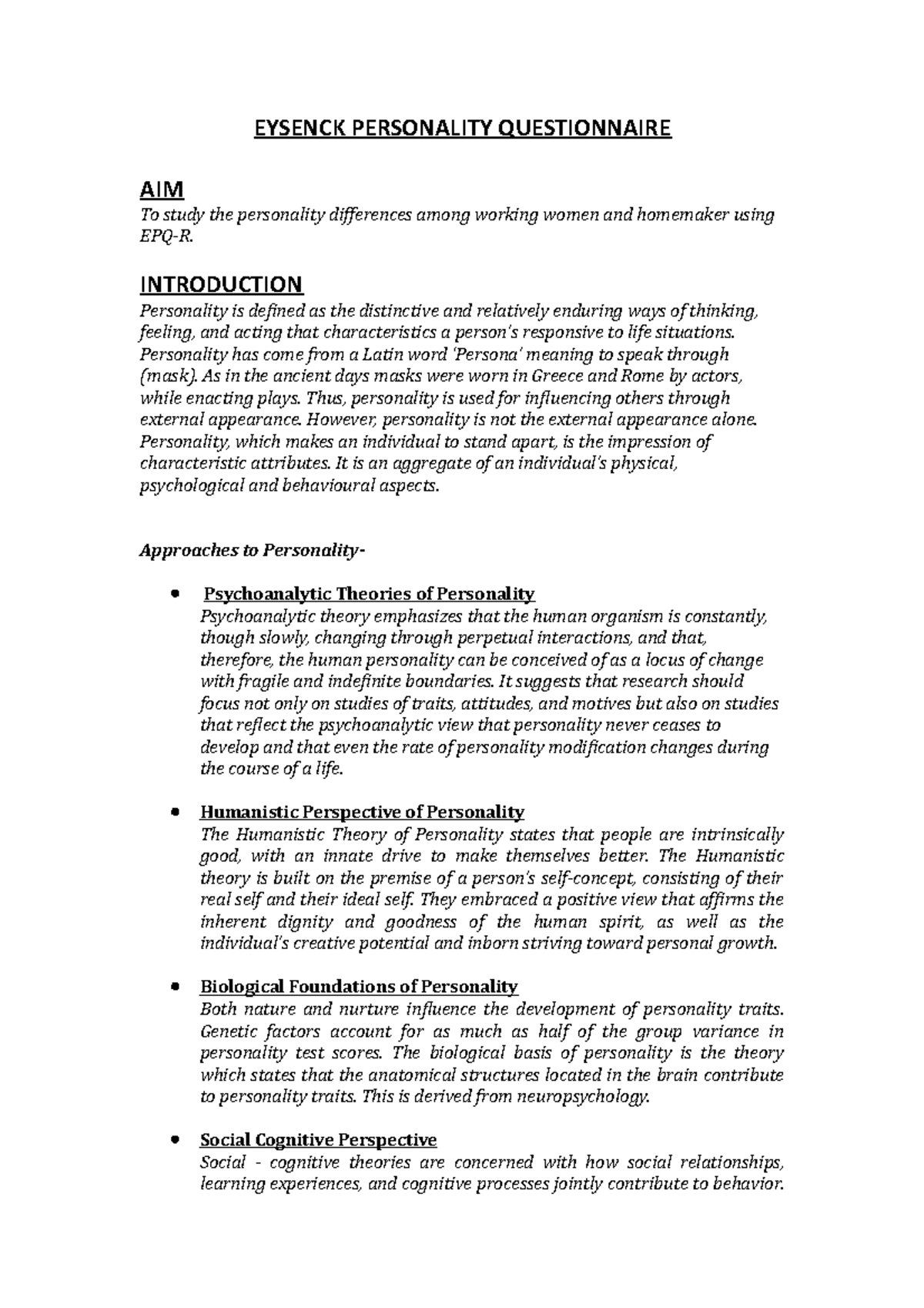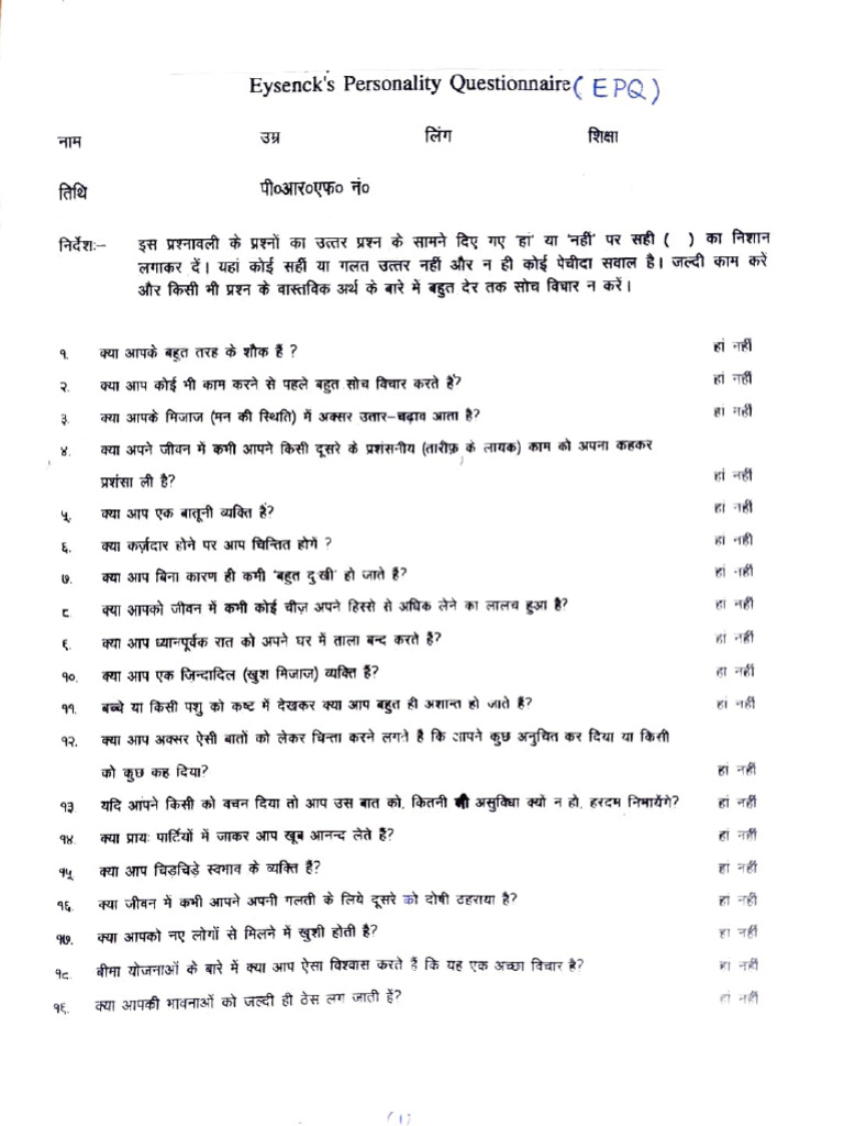 EYSENCK PERSONALITY QUESTIONNAIRE: Personality Differences Study (EPQ ...