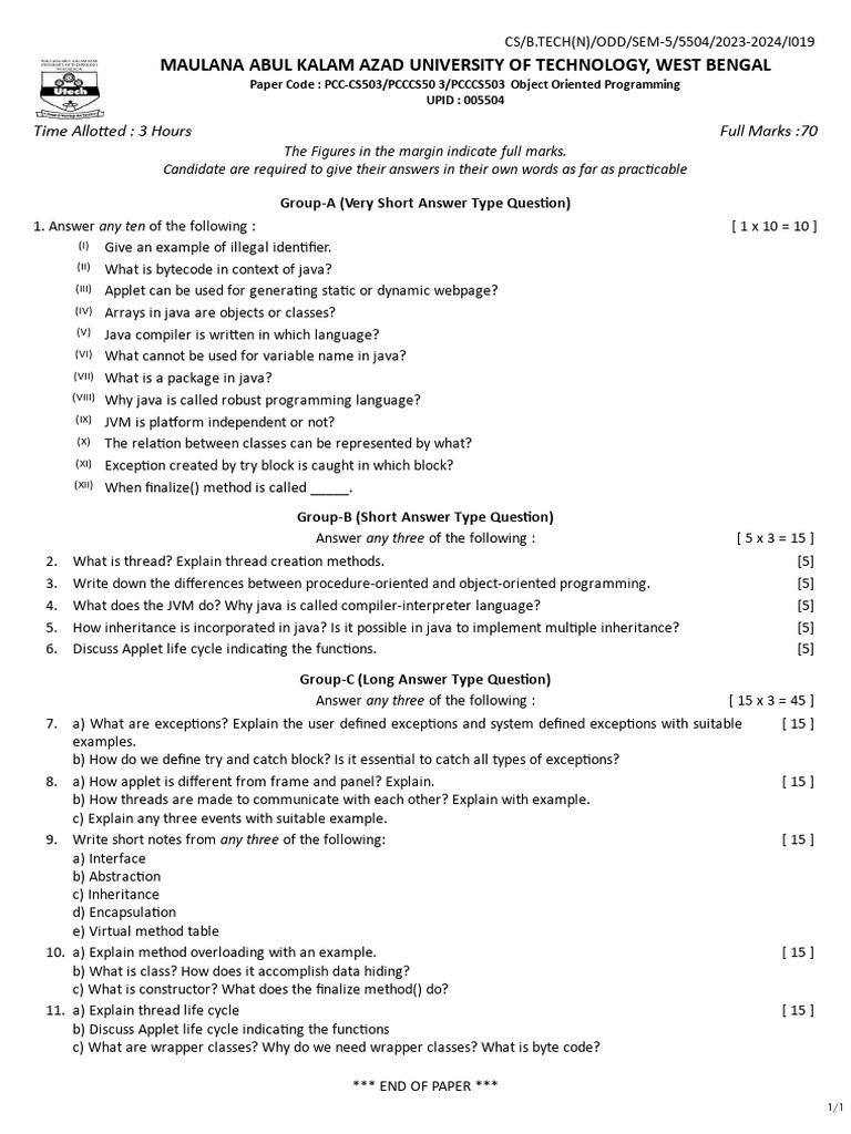 Btech Cse 5 Sem Object Oriented Programming PCC cs503 2024 | PDF | Java ...