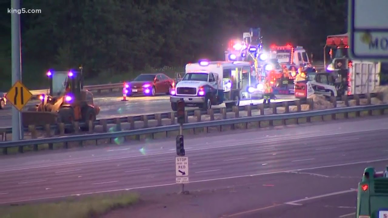 Overturned semi-truck spills fish onto NB I-5 in Marysville