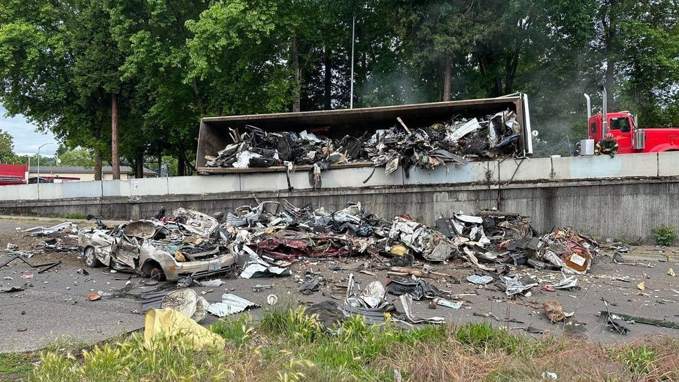 Semi-truck overturns, spills scrap metal on 7th and Washington in Eugene