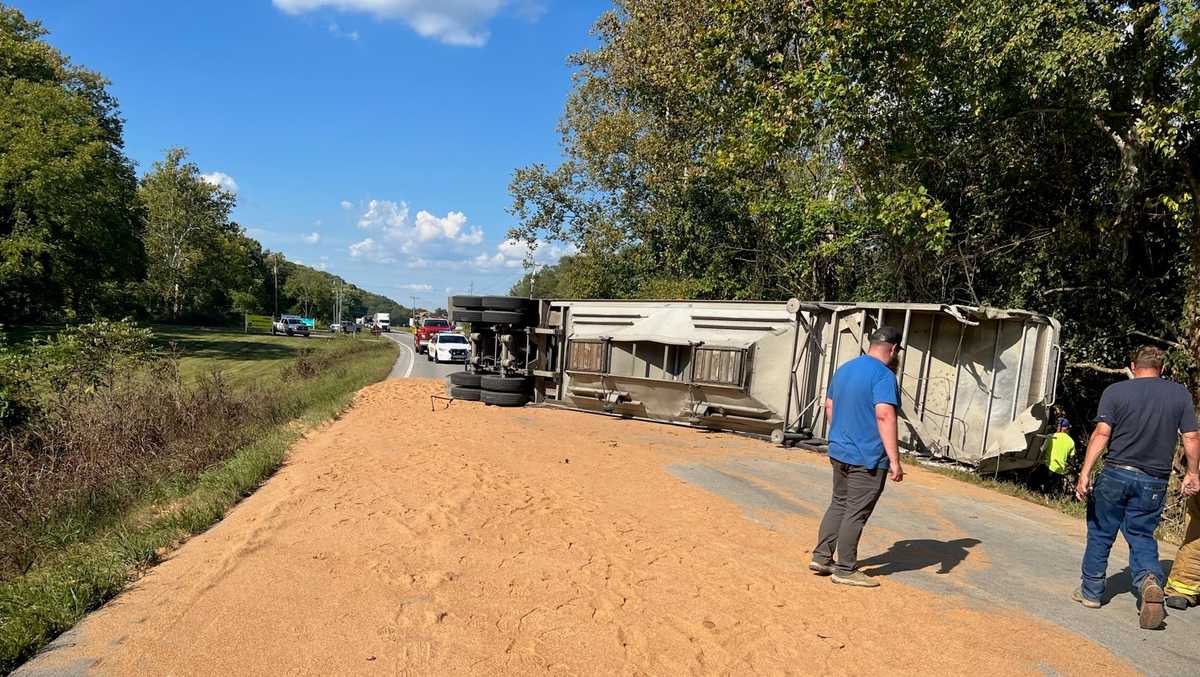 Semi-truck overturns, spills 80,000 pounds of animal feed on highway in ...