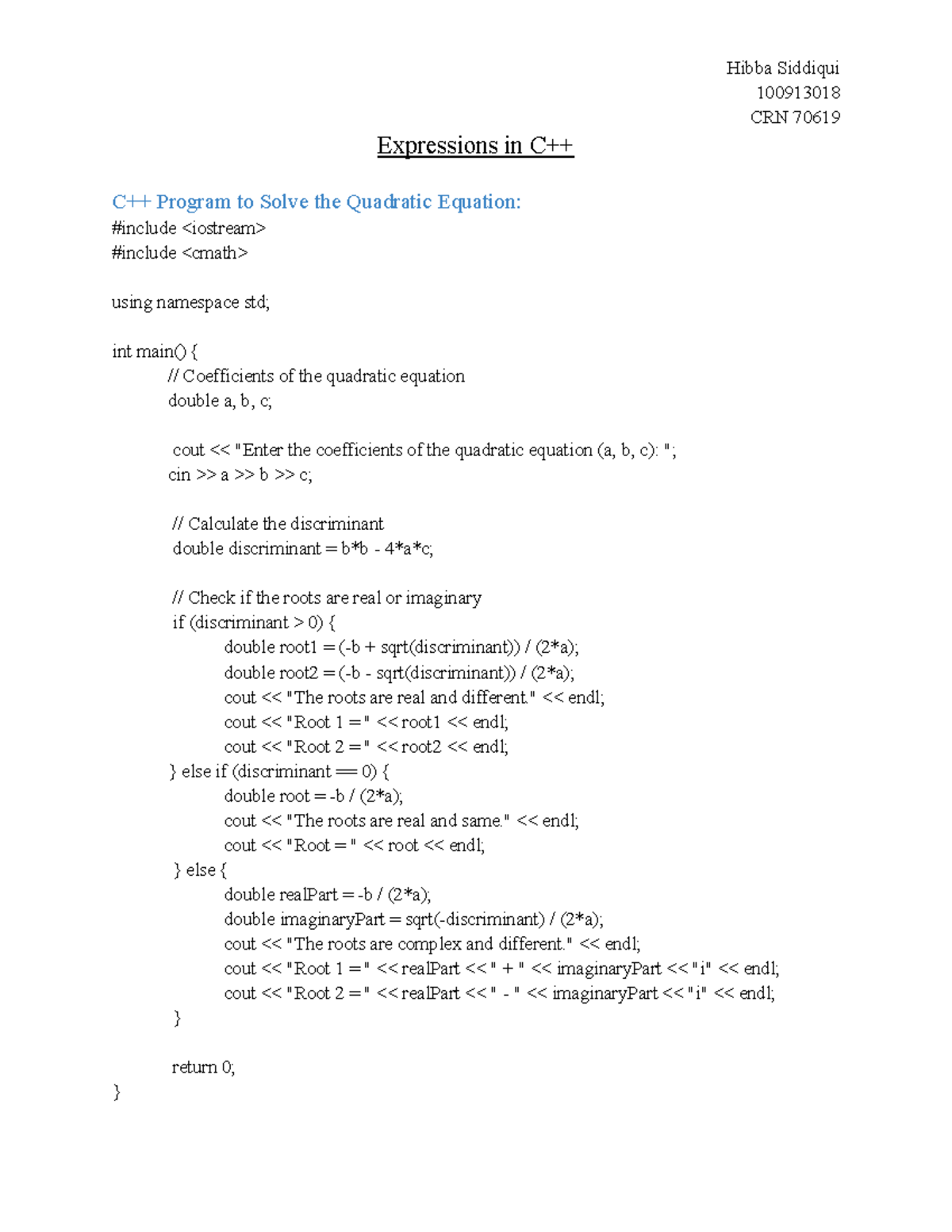 Tutorial 3 2023 - Hibba Siddiqui 100913018 CRN 70619 Expressions in C++ ...