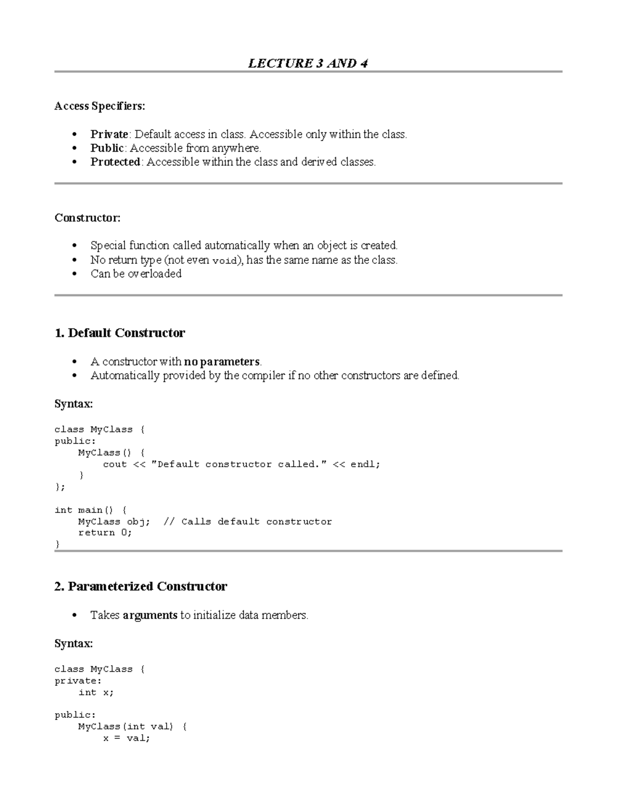 LECTURE 3 & 4: Access Specifiers & Constructors in C++ - Studocu