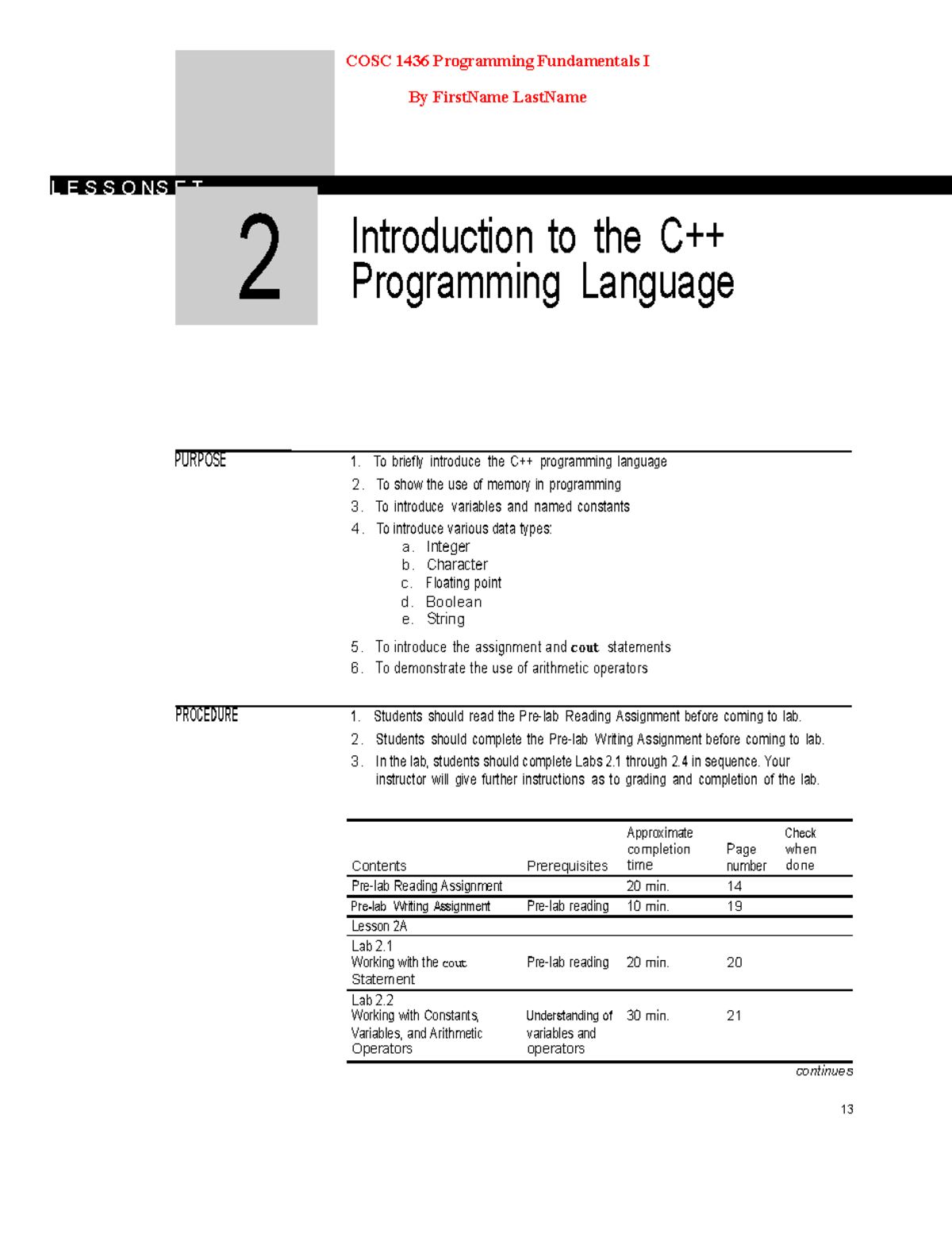 COSC 1436 Lab 2 - Intro to C++ Programming Concepts and Procedures ...