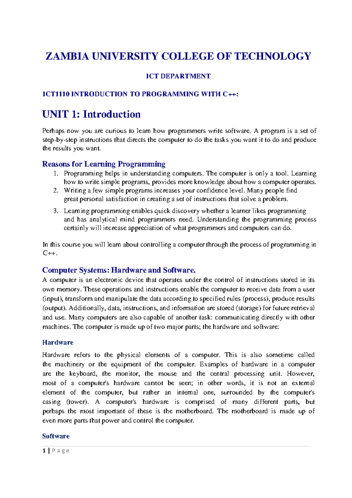 UNIT 1 B ICT1110 Intro to Programming Concepts with C++ - Studocu