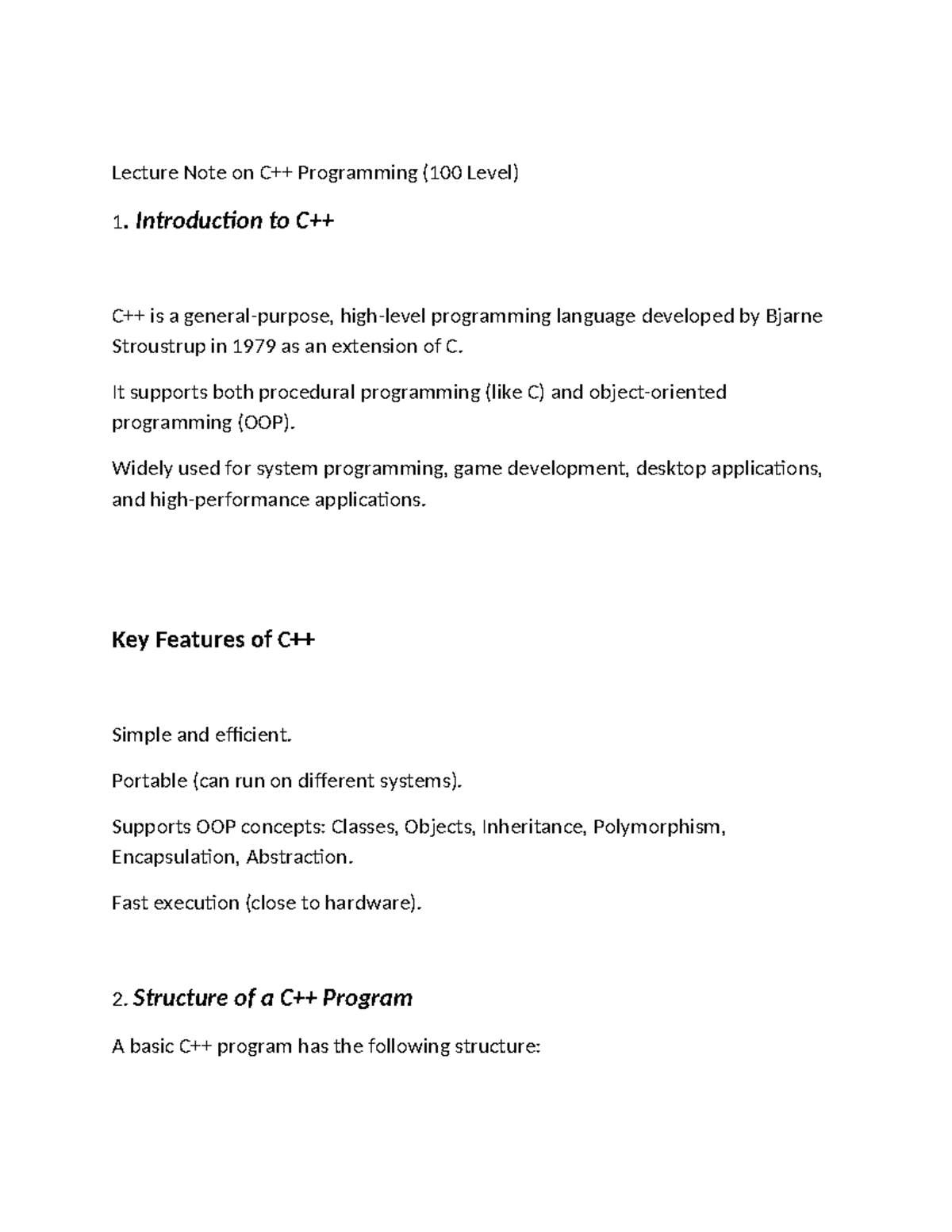 Lecture Note on C++ (100 Level): Key Concepts & Structure - Studocu