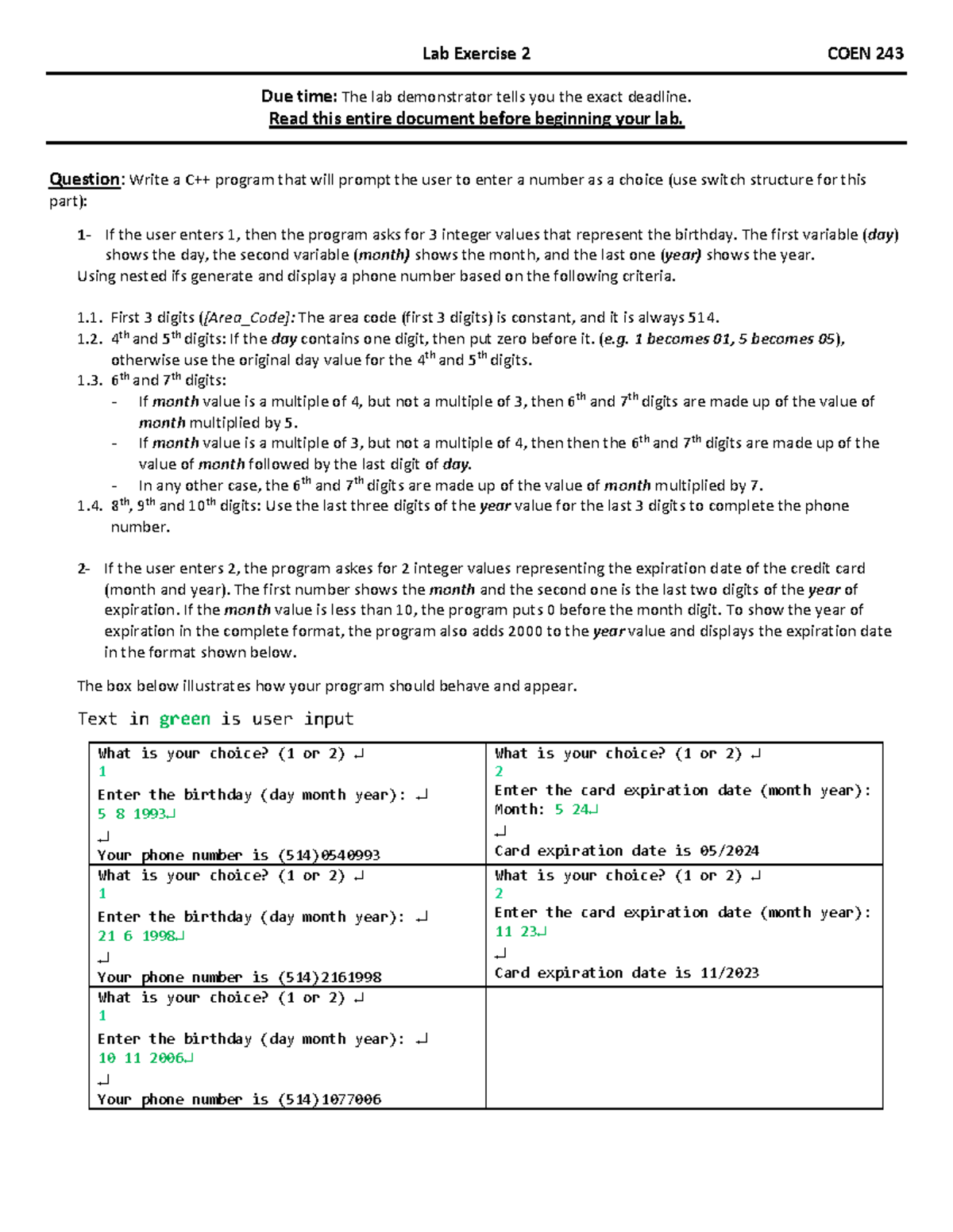 Lab 2 Assignment: C++ Program with User Input Choices for COEN 243 ...