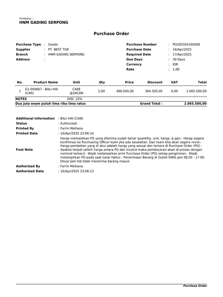 PO Pembelian BALI HAI dari HNM GADING | PDF