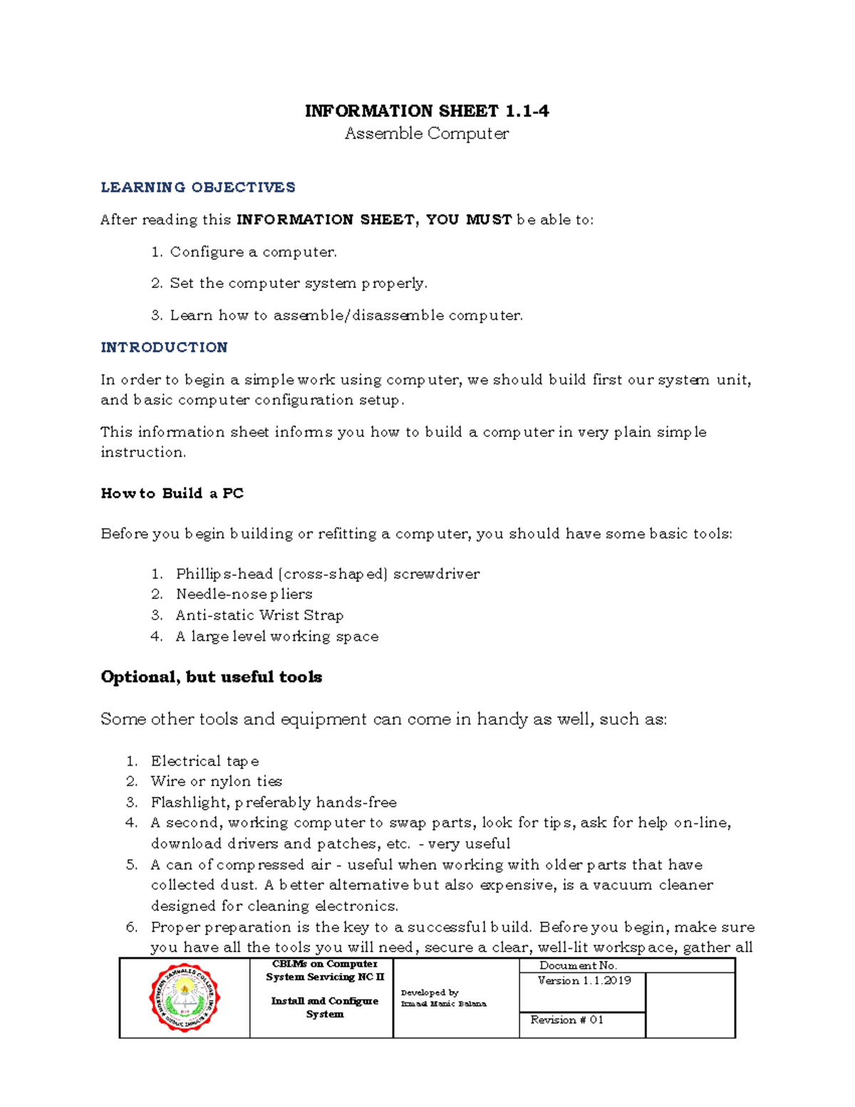 1.1-4 Assemble Computer Hardware - CBLMs on Computer System Servicing ...